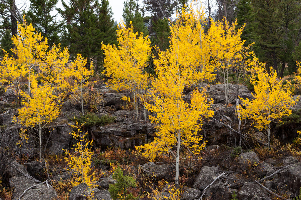 While Yellowstone can’t claim the fall foliage fame of New England, the park’s landscape does dazzle with golden aspens, yellow grasses, and red-leafed shrubs. In a typical year, the peak time for viewing color in the park is from the last week of September through the first week of October. Some of the most colorful spots are Mammoth Hot Springs, the Lamar Valley, Blacktail Plateau Drive, and Lewis River near the falls and in the Lewis River Canyon.