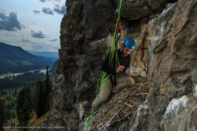 Researcher preparing to place a remote camera in an empty golden eagle nest.