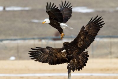 A golden eagle fends off a bald eagle from a deer carcass – in Paradise Valley north of the park.