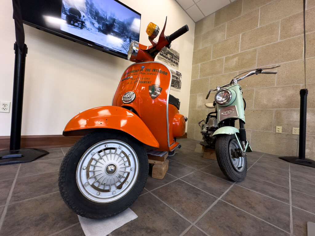 The park’s museum collection houses over 40 vehicles, both horse-drawn and motorized. Currently, the majority reside in off-site storage, and were recently treated under our cyclical cleaning program. Visitors are encouraged to come see two of our historic vehicles on display in the Heritage and Research Center; a 1974 Vespa Model 125 Primavera Scooter and a 1964 Cushman Model 765 Eagle Motor scooter.