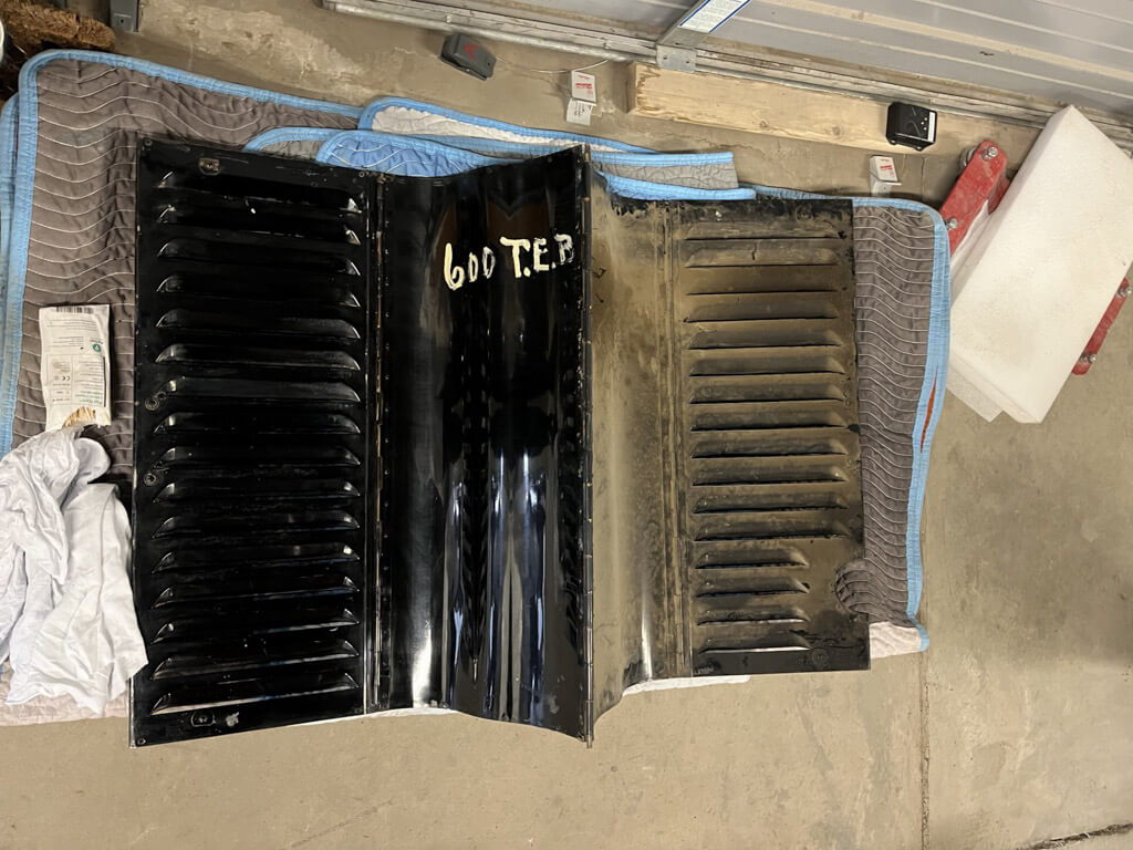 Once that was completed, we addressed the metal components. For most of the parts we used a two-step cleaning process; we gently rubbed away dirt and dust with a mixture of vulpex and mineral spirits, followed by a round of just mineral spirits to remove any residue and remaining dirt. The engine hood was removed to allow for internal cleaning of that piece and the engine itself. What the team found was a great deal of grease on the metal which required a different solution.