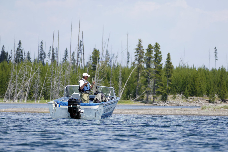 Fishing in Yellowstone Lake from motorboat. NPS/Diane Renkin