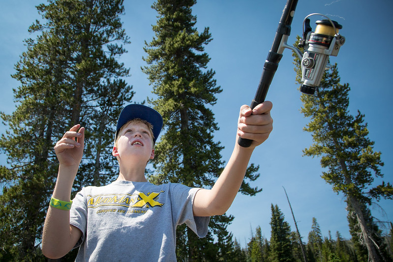 Young visitor casting a line into Lewis Lake. NPS/Neal Herbert