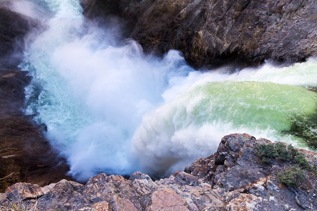The sound and power of the Lower Falls of the Yellowstone River is never greater than in late spring where peak snowmelt runoff dumps 63,500 gallons of water over the falls per second.