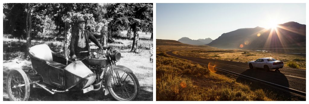 Then: Chief Ranger James McBride, motorcycle with side car; circa 1921 | Now: Sunrise drive in Lamar Valley.