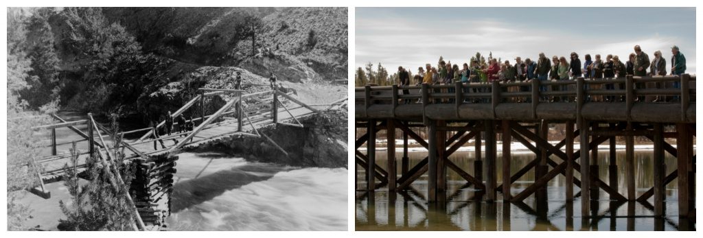 Then: Jack Baronett’s toll bridge across the Yellowstone River; 1879 | Now: Visitors on Fishing Bridge at Yellowstone Lake.
