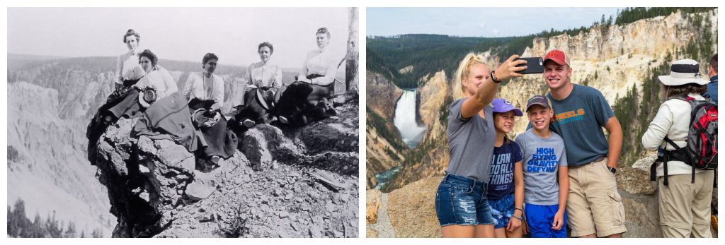 Then: Employees sitting on the Canyon rim; 1904 | Now: Family taking a selfie at Artist Point.