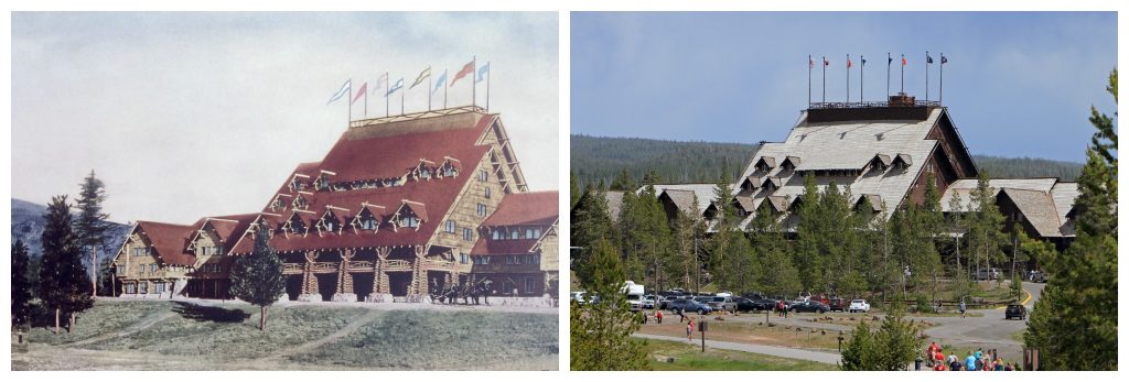 Then: F.J. Haynes colored postcard of the Old Faithful Inn; Date unknown | Now: Old Faithful Inn in summer.