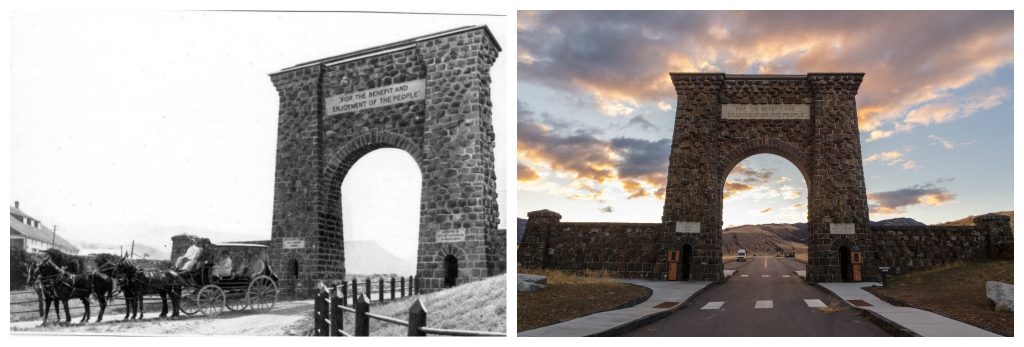 Then: Stagecoach at Roosevelt Arch; circa 1914 | Now: Roosevelt Arch at sunrise.