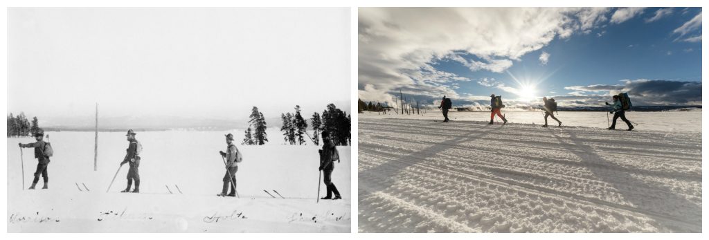 Then: Ski expedition to Fall River; 1897 | Now: Backcountry campers ski along the road in the Lower Geyser Basin at sunset.