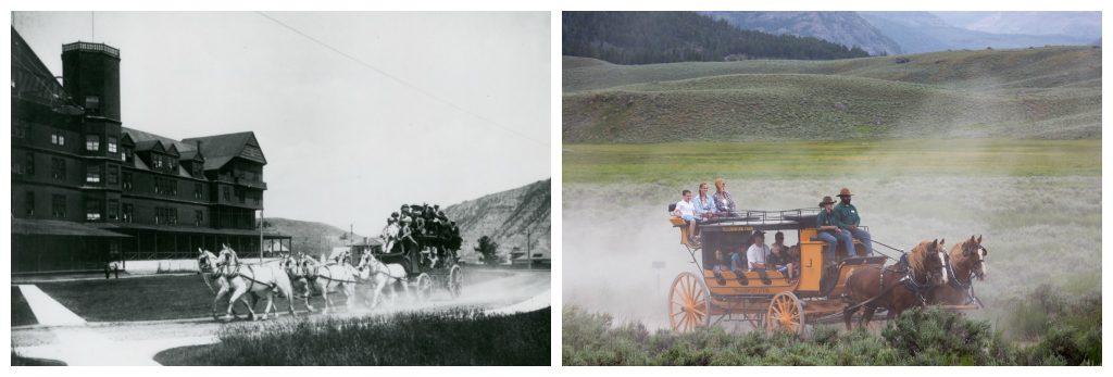 Then: Tally-Ho Stage passing in front of the old National Hotel; 1904 | Now: Stagecoach ride from Roosevelt Lodge.