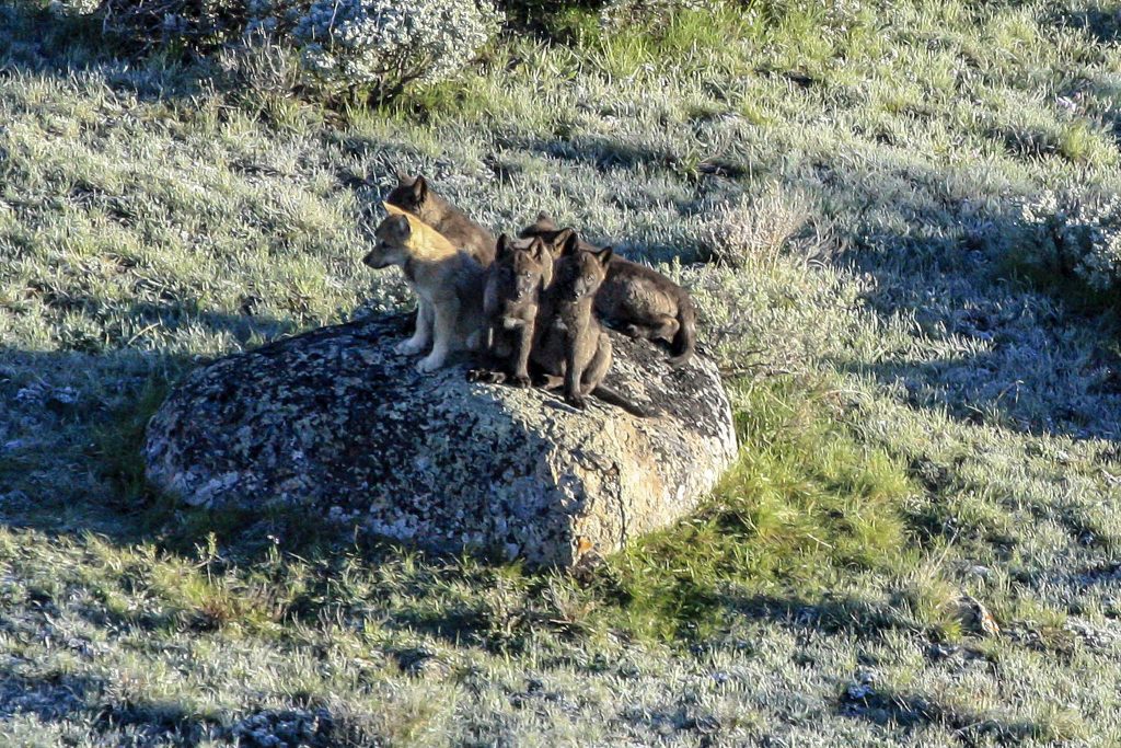 9. Female wolves give birth to an average of 5 pups in April. Young emerge from the den at 10-14 days. The pack remains at the den for 3-10 weeks unless disturbed.
