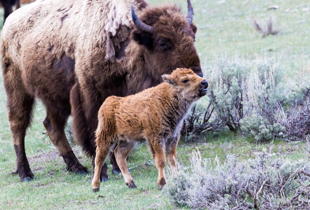 13. Reddish-brown bison calves, sometimes called “red dogs,” are born in late April and May. Calves can keep up with the herd 2 to 3 hours after birth and they are well protected by their mothers and other members of the herd.