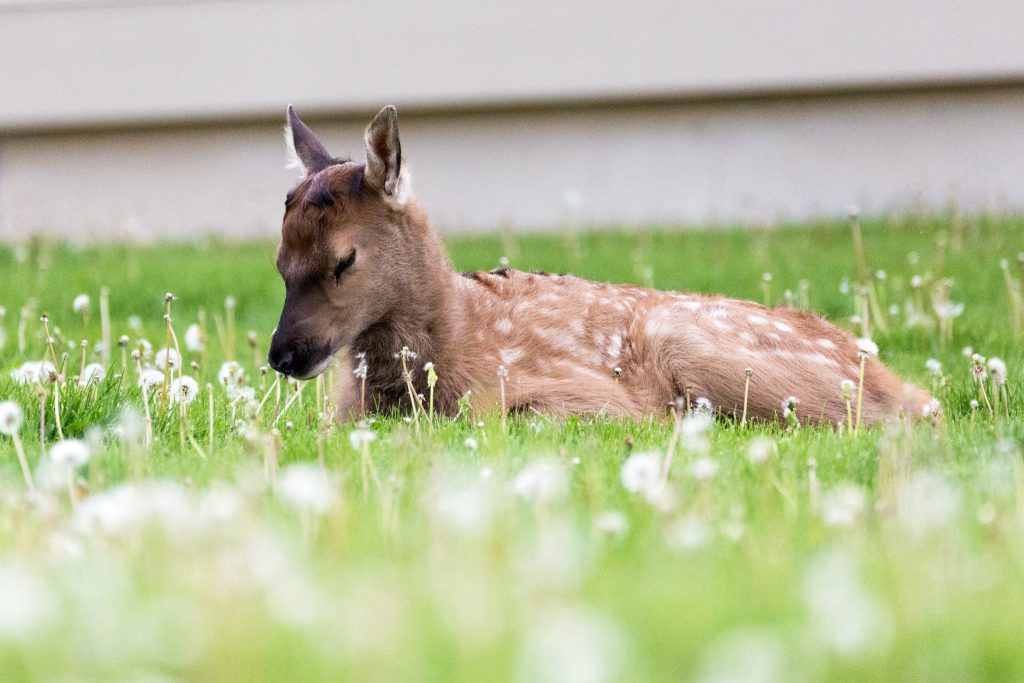 2. Elk cows give birth to a single calf in May or June. The calves are brown with distinct white spots. They can walk within an hour of birth.