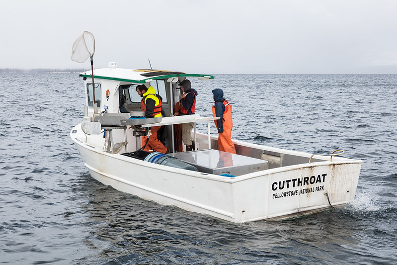 Fish crew members on the Cutthroat in Yellowstone Lake. NPS/Jacob Frank.