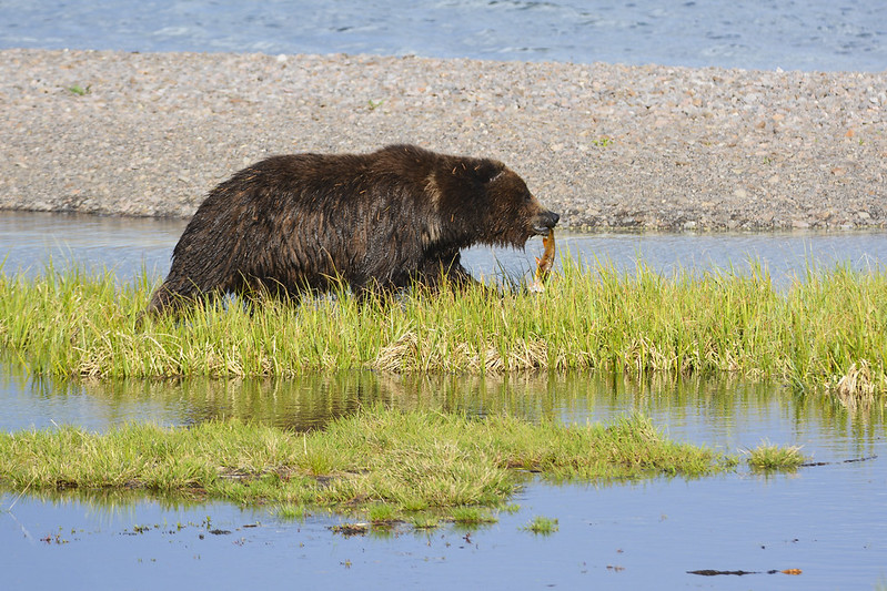 Grizzly bear walks along Yellowstone Lake with a cutthroat trout. NPS/Dylan Schneider.