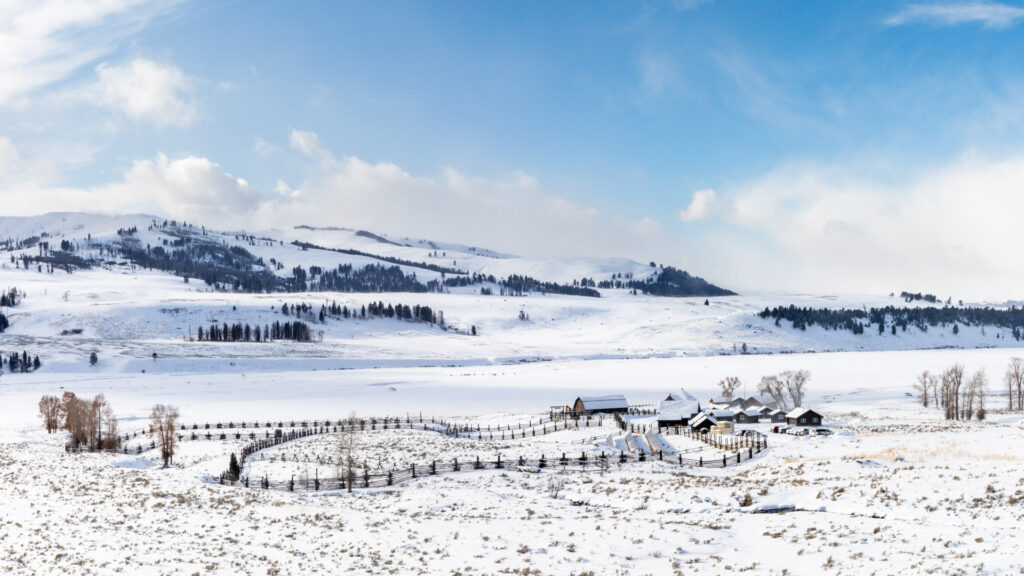 Journey into the northern range and Lamar Valley, where wolves roam the open landscape and are easier to spot in the snow-covered terrain.
