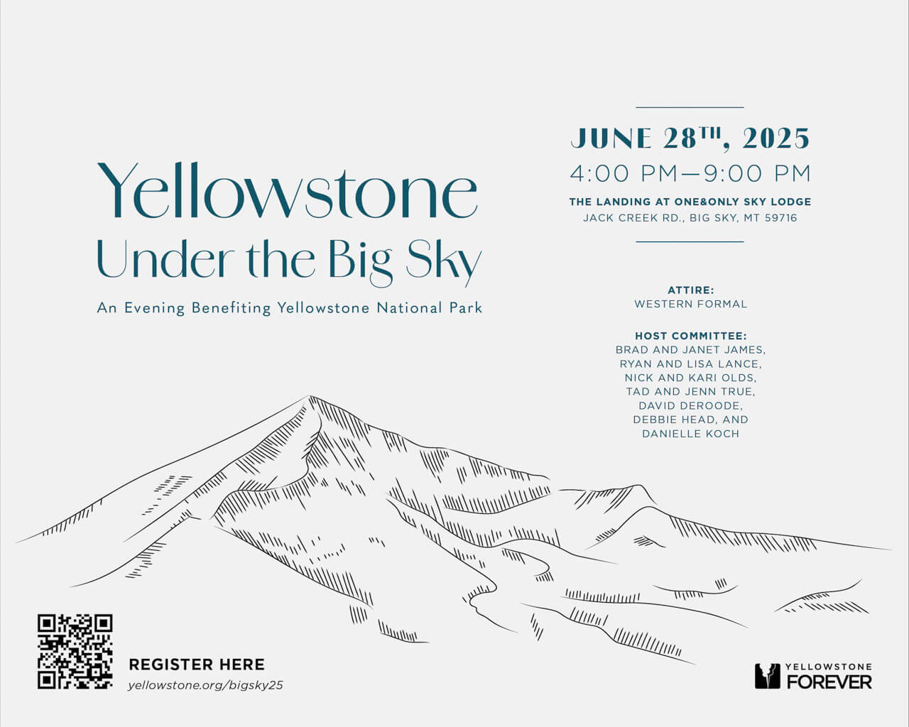 Set against the stunning backdrop of Moonlight Basin, this exclusive gathering will bring together like-minded community leaders and Yellowstone enthusiasts for a night of shared commitment to protecting and preserving the park’s extraordinary landscapes and wildlife for generations to come.