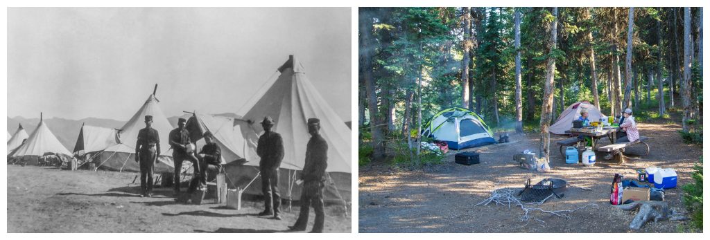 Then: President Theodore Roosevelt’s camp near Calcite Springs; circa 1904 | Now: Campsite at Lewis Lake.
